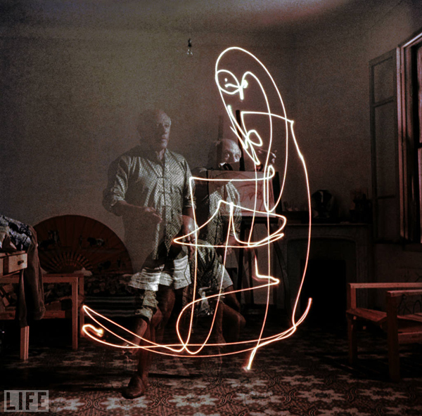 물론 이 5만여 점 중 우리가 피카소 하면 쉽게 떠올리는 회화, 스케치 작품은 1만 5천여 점 정도인데요. 그 외 조형, 도자기, 프린트, 무대 디자인 등의 작품이 무려 3만 5천점에 달합니다. 그중 제가 개인적으로 많은 관심을 가지는 작품은 ‘라이트 페인팅(Light painting)’이라는 작품인데요. 이 작품은 페인팅(Painting)이라는 회화 작품을 뜻하는 제목을 가지고 있지만, 사실은 카메라의 셔터속도를 조정하는 것으로 피카소가 허공에 그려낸 빛의 잔상을 담아내는 사진 기술을 이용한 작품입니다. 굳이 정확하게 분류를 하자면 페인팅이라는 이름과는 다르게 사진 기술을 이용한 사진 작품인 것이죠.